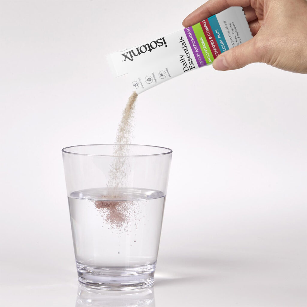 Pour contents of one Isotonix Daily Essentials packet into 8 oz. of water.
